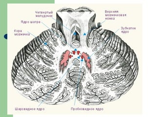 Документ представляет собой лекцию по анатомии центральной нервной системы, охватывающую структуру и функции различных отделов головного мозга, включая продолговатый мозг, задний мозг и мозжечок. Он описывает анатомические структуры, включая доли больших полушарий и ядра черепных нервов, а также их связь с функциональными аспектами, такими как координация движений и регуляция вегетативных функций. Лекция подчеркивает важность белого и серого вещества в функционировании мозга.