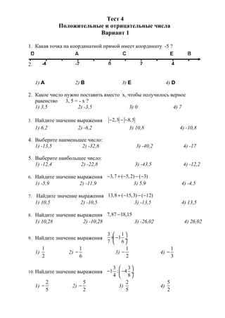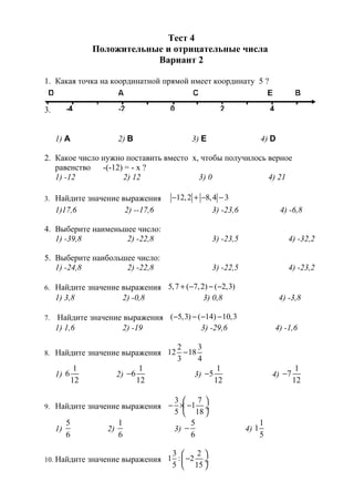 Документ содержит тесты на знания положительных и отрицательных чисел, включая задачи на нахождение координат, уравнения с неизвестными, и вычисления с отрицательными числами. В тесте представлены вопросы с несколькими вариантами ответов, требующие выбора наименьшего или наибольшего числа, а также решения арифметических выражений. Обе части теста включают аналогичные задачи, но с различными значениями и условиями.