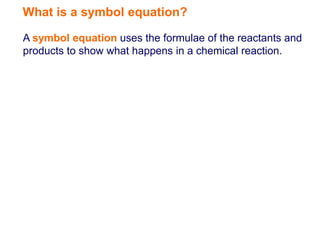 A symbol equation uses chemical formulas to represent reactants and products in a chemical reaction. It must be balanced to show the correct ratio between reactants and products undergoing the reaction. For example, the symbol equation given shows that one atom of sulfur reacting with one molecule of oxygen produces one molecule of sulfur dioxide.