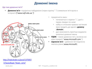 • Доменне ім'я – ієрархічно побудоване (через крапку ".") символьне ім'я вузла в