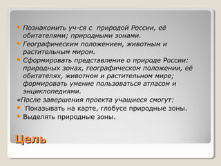 Документ представляет собой план урока для 4 класса по изучению природы России, её природных зон, животного и растительного мира. Цель урока - сформировать у учащихся представление о географическом положении России и развить навыки работы с картами и энциклопедиями. Урок включает различные виды деятельности, такие как тесты, викторины и практическая работа, а также подведение итогов с оценкой понимания материала.