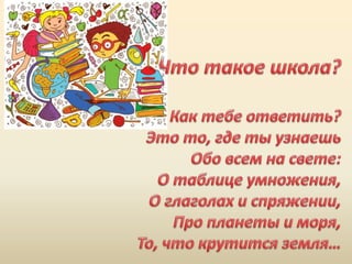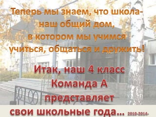 Документ представляет собой хронологию первых школьных лет детей в гимназии № 13 г. Екатеринбурга, начиная с 1 сентября 2010 года. Он включает в себя вопросы детей о мире и описания их развития на протяжении четырех лет в школе с упоминанием первой учительницы Ольги Александровны. Каждое новое школьное приключение отражает эмоциональную значимость и радость от учебы и дружбы.