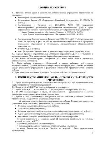Документ содержит правила приема, перевода и отчисления воспитанников в муниципальном бюджетном дошкольном образовательном учреждении «детский сад no 10». Процедуры основаны на действующем законодательстве Российской Федерации и включают требования к документам, которые должны предоставить родители. Также документ затрагивает вопросы наполняемости групп и обязанностей заведующего учреждения по оформлению приемов и приказов.