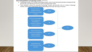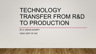 This document discusses technology transfer from R&D to production. It defines technology transfer and explains its importance for moving from drug discovery to commercialization. It outlines various stages of formulation development and discusses procedures for technology transfer including development reports, product specifications, technology transfer plans and documentation. It emphasizes the importance of communication between transferring and receiving parties and quality assurance approval. Technical information to be transferred includes details on facilities, equipment, manufacturing methods and test methods.