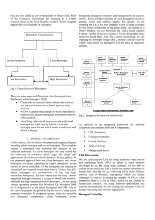 The document describes a hybrid honeypot framework for collecting and analyzing malware. The framework uses both client honeypots and server honeypots controlled by a central honeypot controller. Client honeypots actively visit URLs to detect client-side attacks, while server honeypots passively detect server-side attacks. Collected malware is stored in a central database and analyzed on an analysis server to detect known and unknown malware types through dynamic execution and static analysis. The integrated framework was able to collect thousands of malware samples, including some not detected by antivirus software.