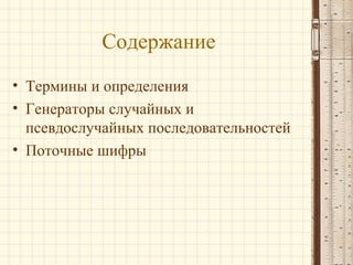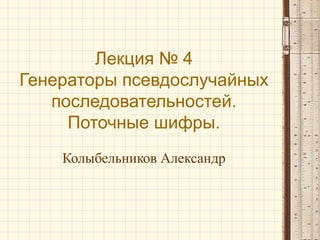 Лекция посвящена генераторам псевдослучайных последовательностей и поточным шифрам, включая определения и различия между генераторами случайных и псевдослучайных чисел. Рассматриваются типы поточных шифров, такие как самосинхронизирующиеся и синхронные, а также их особенности, уязвимости и требования. В заключении упоминаются конкретные примеры шифров, такие как RC4 и A5.