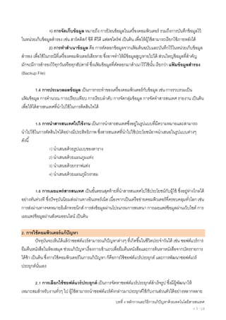 น้ า | 2 1) การจัดเก็บข้อมูล หมายถึง การป้ อนข้อมูลในเครื่องคอมพิวเตอร์ รวมถึงการบันทึกข้อมูลไว้ ในหน่วยเก็บข้อมูลสํารอง เช่น ฮาร์ดดิสก์ ซีดี ดีวีดี แฟลชไดร์ฟ เป็นต้น เพื่อให้ผู้ใช้สามารถเรียกใช้ภายหลังได้ 2) การทําสําเนาข้อมูล คือ การคัดลอกข้อมูลจากแฟ้ มต้นฉบับและบันทึกไว้ในหน่วยเก็บข้อมูล สํารอง เพื่อใช้ในกรณีที่เครื่องคอมพิวเตอร์เสียหาย ซึ่งอาจทําให้มีข้อมูลสูญหายไปได้ ส่วนใหญ่ข้อมูลที่สําคัญ มักจะมีการสํารองไว้ทุกวันหรือทุกสัปดาห์ ซึ่งแฟ้ มข้อมูลที่คัดลอกมาสําเนาไว้ใช้นั้น เรียกว่า แฟ้ มข้อมูลสํารอง (Backup File) 1.4 การประมวลผลข้อมูล เป็นการกระทําของเครื่องคอมพิวเตอร์กับข้อมูล เช่น การรวบรวมเป็น แฟ้ มข้อมูล การคํานวณ การเปรียบเทียบ การเรียบลําดับ การจัดกลุ่มข้อมูล การจัดทําสารสนเทศ รายงาน เป็นต้น เพื่อให้ได้สารสนเทศที่นําไปใช้ในการติดสินใจได้ 1.5 การนําสารสนเทศไปใช้งาน เป็นการนําสารสนเทศซึ่งอยู่ในรูปแบบที่มีความหมายและสามารถ นําไปใช้ในการตัดสินใจได้อย่างมีประสิทธิภาพ ซึ่งสารสนเทศที่นําไปใช้ประโยชน์อาจนําเสนอในรูปแบบต่างๆ ดังนี้ 1) นําเสนอด้วยรูปแบบของตาราง 2) นําเสนอด้วยแผนภูมแท่ง 3) นําเสนอด้วยกราฟแท่ง 4) นําเสนอด้วยแผนภูมิวงกลม 1.6 การเผยแพร่สารสนเทศ เป็นขั้นตอนสุดท้ายที่นําสารสนเทศไปใช้ประโยชน์กับผู้ใช้ ซึ่งอยู่ห่างไกลได้ อย่างทันท่วงที ซึ่งปัจจุบันนิยมส่งผ่านทางอินเทอร์เน็ต เนื่องจากเป็นเครือข่ายคอมพิวเตอร์ที่ครอบคลุมทั่วโลก เช่น การส่งผ่านทางจดหมายอิเล็กทรอนิกส์ การส่งข้อมูลผ่านโปรแกรมการสนทนา การเผยแพร่ข้อมูลผ่านเว็บไซต์ การ เผยแพร่ข้อมูลผ่านสังคมออนไลน์ เป็นต้น 2. การใช้คอมพิวเตอร์แก้ปัญหา ปัจจุบันจะเห็นได้แล้ว่าซอฟต์แวร์สามารถแก้ปัญหาต่างๆ ที่เกิดขึ้นในชีวิตประจําวันได้ เช่น ซอฟต์แวร์การ ยืมคืนหนังสือในห้องสมุด ช่วยแก้ปัญหาเรื่องการเข้าแถวเพื่อยืมคืนหนังสือและการค้นหาหนังสือจากบัตรรายการ ได้ช้า เป็นต้น ซึ่งการใช้คอมพิวเตอร์ในการแก้ปัญหา ก็คือการใช้ซอฟต์แวร์ประยุกต์ และการพัฒนาซอฟต์แวร์ ประยุกต์นั่นเอง 2.1 การเลือกใช้ซอฟต์แวร์ประยุกต์ เป็นการจัดหาซอฟต์แวร์ประยุกต์สําเร็จรูป ซึ่งมีผู้พัฒนาให้ เหมาะสมสําหรับงานทั่วๆ ไป ผู้ใช้สามารถนําซอฟต์แวร์ดังกล่าวมาประยุกต์ใช้กับงานส่วนตัวได้อย่างหลากหลาย