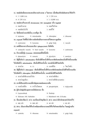 ป็ นสาร nucleoprotein เช่ นเดียวกับ ribosome คือ ิ ก แบคทีเรี ย ข ไวรัส ค รา ง ยีสต์ 24. ไวรัสจัดเป็ นสิ่ งมีชีวตทั้งๆ ทีไวรัสไม่ เป็ นเซลล์ เหตุผลทีจัดไวรัสเป็ นสิ่ งมีชีวตคือ ิ ่ ่ ิ ก สื บพันธุ์ได้ ข กินอาหารได้ ค ปรับตัวได้ ง สร้างอาหารได้ 25. สิ่ งทีเ่ ราสามรถพบได้ ในเซลล์พช แต่ ไม่ สามารถพบได้ เซลล์สัตว์คือ ื ก cell membrane , chloroplast ข cell wall , cell membrane ค cell wall , vacuole ง cell wall , chloroplast 26. cellular respiration เกิดที่ organell ใด ก mitochondria ข centrosome ค chloroplast ง lysosome 27. สารประกอบ RNA นอกจากจะพบที่ ribosome แล้วยังพบทีส่วนใด ่ ก โครโมโซม ข นิวคลีโอลัส ค เยือหุมนิวเคลียส ่ ้ ง เยือหุมเซลล์ ่ ้ 28. ส่ วนของไม้ คอร์ กทีมีลกษณะเป็ นห้ องๆ ที่ Robert Hooke เป็ นผู้ค้นพบให้ ชื่อเซลล์ คือ ่ ั ก เยือหุมเซลล์ ่ ้ ข protoplasm ค ผนังเซลล์ ง cytoplasm 29. ส่ วนของเซลล์ ททาหน้ าทีเ่ ป็ นท่อทางผ่านของสารต่ างๆ ในเซลล์คือ ี่ ก endoplasmic reticulum ข microsome ค centrosome ง lysosome 30. ข้ อใดถูกต้ อง ก ไมโทคอนเดรี ยพบมากในเซลล์ไข่เม่นทะเล ไม่พบเลยในเซลล์เยือบุผว ่ ิ ข ไมโทคอนเดรี ยพบมากในเซลล์แบคทีเรี ย ไม่พบเลยในเซลล์ไข่เม่นทะเล ค ไมโทคอนเดรี ยพบมากในเซลล์ไข่เม่นทะเล ไม่พบเลยในเซลล์แบคทีเรี ย ง ไมโทคอนเดรี ยพบมากในเซลล์ตบและเซลล์แบคทีเรี ยที่กาลังแบ่งตัว ั 31. ส่ วนอะโครโซมของอสุ จิเปลียนแปลงมาจาก organell ใด ่ ก lysosome ข centrosome ค golgi complex ง endoplasmic reticulum 32. suicide bag of cell หรือถุงฆ่ าตัวตายหมายถึงอะไร ก vacuole ข lysosome ค golgi complex ง vesicle 33. golgi complex ควรพบมากในอวัยวะส่ วนใด ก ตับ กระเพาะปัสสาวะ ข เซลล์ประสาท เซลล์ผวหนัง ิ ค เซลล์ต่อมหมวกไต เซลล์ต่อมน้ าตา ง เซลล์ต่อมน้ าลาย และเซลล์ต่อมน้ านม