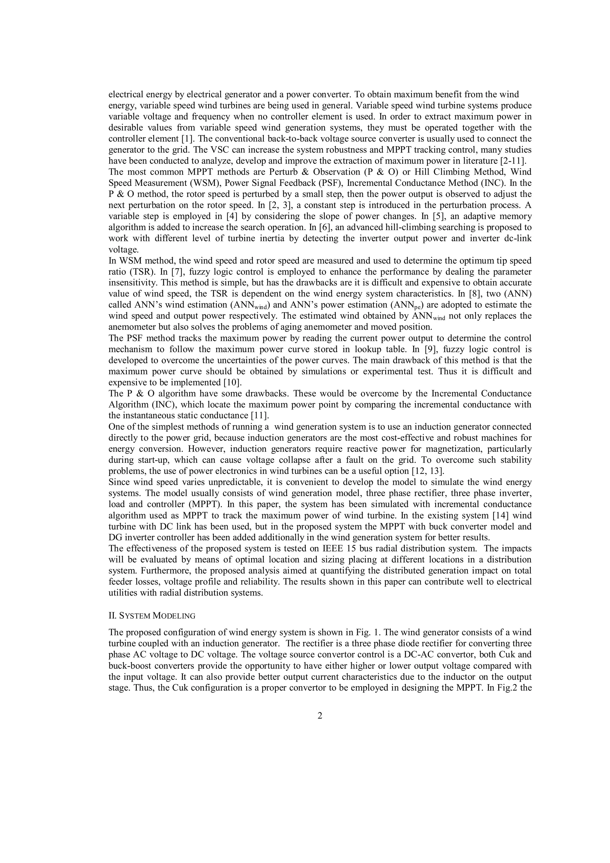 This document summarizes a paper that models and simulates a wind energy conversion system connected to a radial distribution system. It presents the modeling of various components of the wind energy system, including the wind turbine, induction generator, rectifier, DC link controller, inverter, and an incremental conductance maximum power point tracking algorithm. The performance of the wind energy conversion system is analyzed when connected to IEEE 15 bus radial distribution system in MATLAB/Simulink. Simulation results show that integrating distributed generation at optimal locations and sizes can reduce power losses, improve voltage profiles, and increase reliability indices of the distribution system.