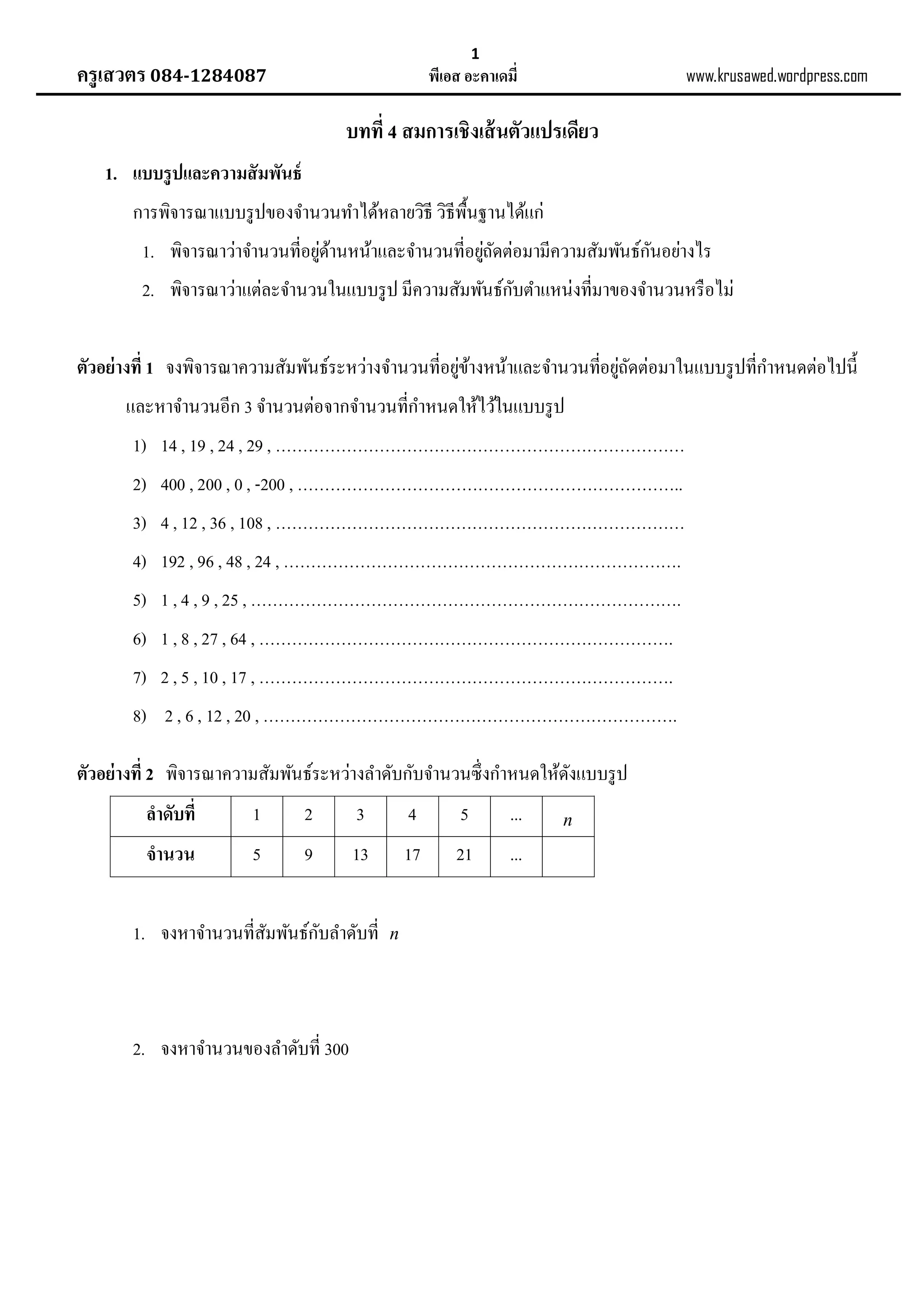 4 สมการเชิงเส้ นตัวแปรเดียว 1. แบบรู ปและความสั มพันธ์ การพิจารณาแบบรู ปของจานวนทาได้หลายวิธี วิธีพ้นฐานได้แก่ ื ่ ้ ่ั ั 1. พิจารณาว่าจานวนที่อยูดานหน้าและจานวนที่อยูถดต่อมามีความสัมพันธ์กนอย่างไร ั 2. พิจารณาว่าแต่ละจานวนในแบบรู ป มีความสัมพันธ์กบตาแหน่งที่มาของจานวนหรื อไม่ ่ ้ ตัวอย่ างที่ 1 จงพิจารณาความสัมพันธ์ระหว่างจานวนที่อยูขางหน้าและจานวนทีอยูถดต่อมาในแบบรู ปที่กาหนดต่อไปนี้ ่ ่ ั และหาจานวนอีก 3 จานวนต่อจากจานวนที่กาหนดให้ไว้ในแบบรู ป 1) 14 , 19 , 24 , 29 , ………………………………………………………………… 2) 400 , 200 , 0 , -200 , …………………………………………………………….. 3) 4 , 12 , 36 , 108 , ………………………………………………………………… 4) 192 , 96 , 48 , 24 , ………………………………………………………………. 5) 1 , 4 , 9 , 25 , ……………………………………………………………………. 6) 1 , 8 , 27 , 64 , …………………………………………………………………. 7) 2 , 5 , 10 , 17 , …………………………………………………………………. 8) 2 , 6 , 12 , 20 , …………………………………………………………………. ตัวอย่ างที่ 2 พิจารณาความสัมพันธ์ระหว่างลาดับกับจานวนซึ่งกาหนดให้ดงแบบรู ป ั ลาดับที่ 1 2 3 4 5 ... จานวน 5 9 13 17 21 ... ั 1. จงหาจานวนที่สมพันธ์กบลาดับที่ ั 2. จงหาจานวนของลาดับที่ 300 n n