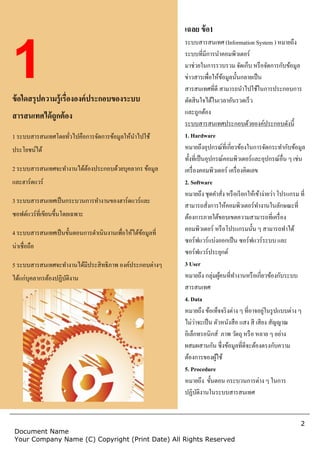 Name (C) Copyright (Print Date) All Rights Reserved 1ข้อใดสรุปความรู้เรื่ององค์ประกอบของระบบ สารสนเทศได้ถูกต้อง 1 ระบบสารสนเทศโดยทั่วไปคือการจัดการข้อมูลให้นาไปใช้ ประโยชน์ได้ 2 ระบบสารสนเทศจะทางานได้ต้องประกอบด้วยบุคลากร ข้อมูล และฮาร์ดแวร์ 3 ระบบสารสนเทศเป็นกระบวนการทางานของฮาร์ดแวร์และ ซอฟต์แวร์ที่เขียนขึ้นโดยเฉพาะ 4 ระบบสารสนเทศเป็นขั้นตอนการดาเนินงานเพื่อให้ได้ข้อมูลที่ น่าเชื่อถือ 5 ระบบสารสนเทศจะทางานได้มีประสิทธิภาพ องค์ประกอบต่างๆ ได้แก่บุคลากรต้องปฏิบัติงาน เฉลย ข้อ1 ระบบสารสนเทศ (Information System ) หมายถึง ระบบที่มีการนาคอมพิวเตอร์ มาช่วยในการรวบรวม จัดเก็บ หรือจัดการกับข้อมูล ข่าวสารเพื่อให้ข้อมูลนั้นกลายเป็น สารสนเทศที่ดี สามารถนาไปใช้ในการประกอบการ ตัดสินใจได้ในเวลาอันรวดเร็ว และถูกต้อง ระบบสารสนเทศประกอบด้วยองค์ประกอบดังนี้ 1. Hardware หมายถึงอุปกรณ์ที่เกี่ยวข้องในการจัดกระทากับข้อมูล ทั้งที่เป็นอุปกรณ์คอมพิวเตอร์และอุปกรณ์อื่น ๆ เช่น เครื่องคอมพิวเตอร์ เครื่องคิดเลข 2. Software หมายถึง ชุดคาสั่ง หรือเรียกให้เข้าง่ายว่า โปรแกรม ที่ สามารถสั่งการให้คอมพิวเตอร์ทางานในลักษณะที่ ต้องการภายใต้ขอบเขตความสามารถที่เครื่อง คอมพิวเตอร์ หรือโปรแกรมนั้น ๆ สามารถทาได้ ซอร์ฟแวร์แบ่งออกเป็น ซอร์ฟแวร์ระบบ และ ซอร์ฟแวร์ประยุกต์ 3 User หมายถึง กลุ่มผู้คนที่ทางานหรือเกี่ยวข้องกับระบบ สารสนเทศ 4. Data หมายถึง ข้อเท็จจริงต่าง ๆ ที่อาจอยู่ในรูปแบบต่าง ๆ ไม่ว่าจะเป็น ตัวหนังสือ แสง สี เสียง สัญญาณ อิเล็กทรอนิกส์ ภาพ วัตถุ หรือ หลาย ๆ อย่าง ผสมผสานกัน ซึ่งข้อมูลที่ดีจะต้องตรงกับความ ต้องการของผู้ใช้ 5. Procedure หมายถึง ขั้นตอน กระบวนการต่าง ๆ ในการ ปฏิบัติงานในระบบสารสนเทศ