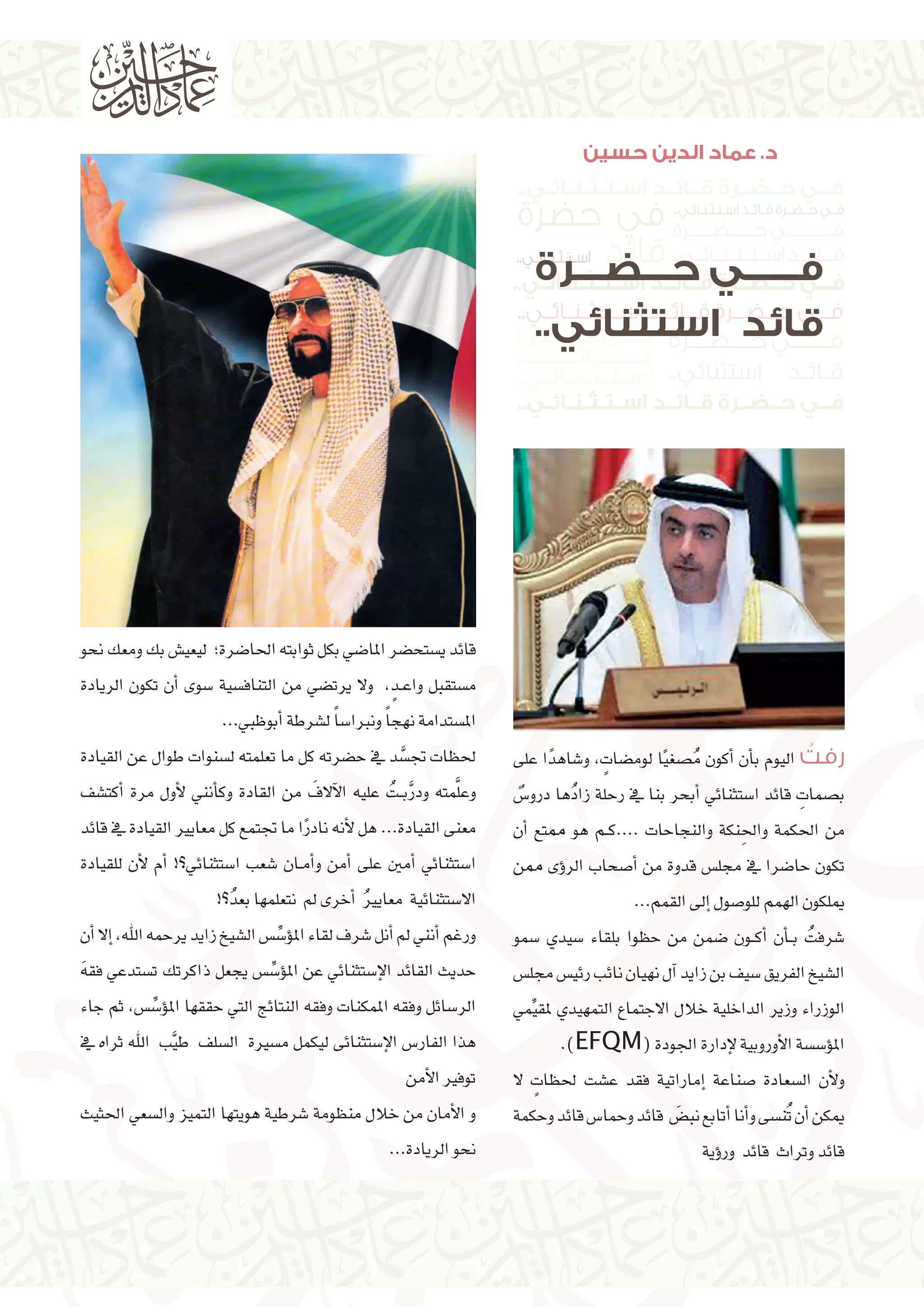 يتناول المستند موضوع القيادة الاستثنائية ودورها في تعزيز السعادة والتميز في المجتمع الإماراتي. يستعرض أيضًا أهمية القيم والثوابت في بناء مجتمع مستدام وقادر على مواجهة التحديات. كما يشير إلى تجارب القيادة والتعلم المستمر كعوامل أساسية لتحقيق النجاح.