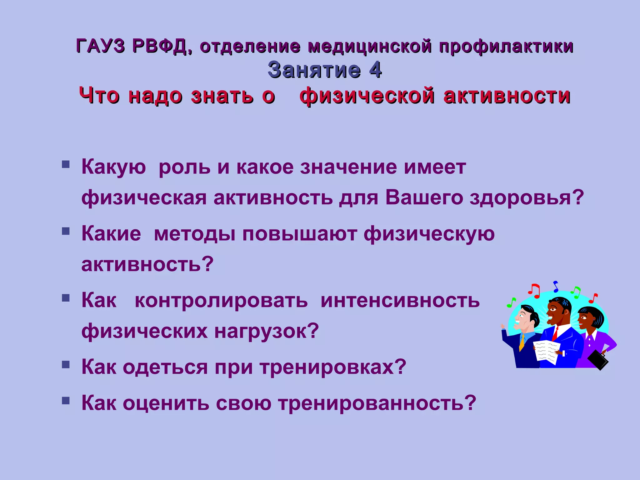Документ описывает важность физической активности для здоровья, методы повышения активности и способы контроля интенсивности нагрузок. Он также предоставляет информацию о тренированности сердечно-сосудистой системы и рекомендует подходы к проведению оздоровительных занятий. В документе указаны противопоказания для аэробных нагрузок и критерии оценки физической активности.