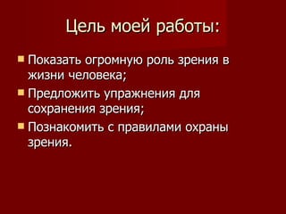 Презентация затрагивает важность зрения в жизни человека и предлагает упражнения для его сохранения, включая правила охраны зрения. Документ также предупреждает о растущей проблеме ухудшения зрения и факторах, которые на это влияют. В заключении подчеркивается необходимость заботиться о своих глазах и следовать рекомендациям для предотвращения проблем со зрением.