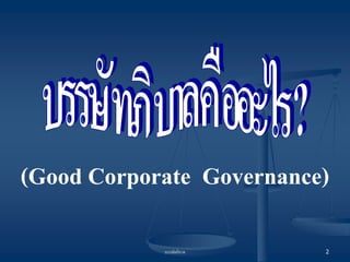: ธรรมาภิบาล บรรษัทภิบาล (Good Corporate Governance) ธรรมาภิบาล (Good Governance) การบริหารจัดการที่ดี หรือ ระบบการกากับดูแลกิจการที่ดี