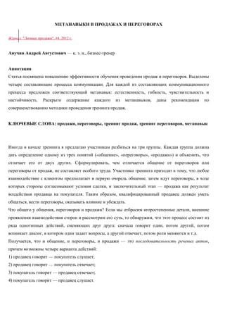 Статья посвящена улучшению обучения проведению продаж и переговоров, выделяя четыре метанавыка: естественность, гибкость, чувствительность и настойчивость, которые необходимы для эффективной коммуникации. Каждый метанавык сопровождается рекомендациями по его развитию и применению на практике, что способствует повышению мастерства продавцов. Авторам подчеркивается значимость влияния продавца на покупателя и способы, с помощью которых это влияние можно добиться.