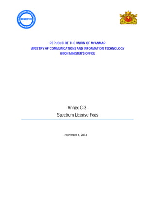 This document outlines proposed spectrum license fees in Myanmar. It describes three types of fees: initial fees charged once when applying for a license, annual fees for ongoing use of spectrum, and renewal fees for extending an existing license. Fees vary based on the type of license, including licenses for public land mobile spectrum, maritime stations, aircraft stations, satellites, private networks, fixed spectrum, broadcasting, amateur users, and special temporary licenses. Formulas are provided for calculating some annual fees based on bandwidth used and other factors. Fees are generally stated in US dollars and may be adjusted over time.