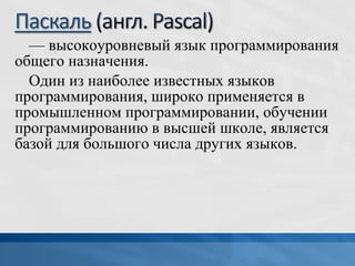 Документ описывает язык программирования Паскаль, его использование и применение в обучении программированию. Особое внимание уделяется компилятору Pascal ABC, разработанному для студентов и школьников, а также основам синтаксиса и операторам, таким как константы и вывод на экран. Важно упомянуть, что документ включает инструкции по написанию и запуску простой программы на Паскале.