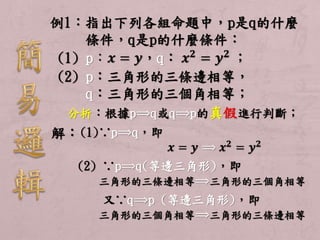 p:풙 = 풚,q: 풙ퟐ = 풚ퟐ ; (2) p:三角形的三條邊相等, q:三角形的三個角相等; 分析:根據p⟹q或q⟹p的真假進行判斷; 解: (1)∵p⟹q,即 풙 = 풚 ⟹ 풙ퟐ = 풚ퟐ (2) ∵p⟹q(等邊三角形),即 三角形的三條邊相等⟹三角形的三個角相等 又∵q⟹p (等邊三角形),即 三角形的三個角相等⟹三角形的三條邊相等