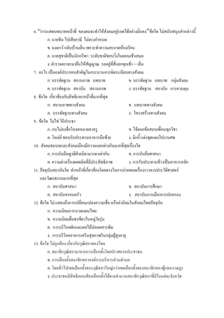ไม่สนับสนุนคากล่าวนี้ ก. นายชิน ไปเสียภาษี ไม่ตรงกาหนด ข. นงเยาว์ กลับบ้านเย็น เพราะทาความสะอาดห้องเรียน ค. นายสุชาติเป็นนักกรีฑา ระดับชาติชอบวิ่งในตอนเช้าเสมอ ง. ตารวจจราจรมายืนให้สัญญาณ รถอยู่ที่สี่แยกทุกเช้า – เย็น 7. อะไร เป็นองค์ประกอบสาคัญในกระบวนการจัดระเบียบทางสังคม ก. บรรทัดฐาน สถานภาพ บทบาท ข. บรรทัดฐาน บทบาท กลุ่มสังคม ค. บรรทัดฐาน สถาบัน สถานภาพ ง. บรรทัดฐาน สถาบัน การควบคุม 8. ข้อใด เกี่ยวข้องกับสิทธิและหน้าที่มากที่สุด ก. สถานภาพทางสังคม ข. บทบาททางสังคม ค. บรรทัดฐานทางสังคม ง. โครงสร้างทางสังคม 9. ข้อใด ไม่ใช่ วิถีประชา ก. กบไม่ลงชื่อในจดหมายลาครู ข. ไจ๋ลอกข้อสอบเพื่อนทุกวิชา ค. โอเล่ย์ ชอบรับประทานอาหารมือซ้าย ง. มิกกี้ แต่งชุดแดงไปงานศพ 10. สังคมชนบทและสังคมเมืองมีความแตกต่างกันมากที่สุดเรื่องใด ก. การนับถือญาติฝ่ายบิดามารดาเท่ากัน ข. การนับถือศาสนา ค. ความต่างเรื่องผลผลิตที่มีประสิทธิภาพ ง. การรับประทานข้าวเป็นอาหารหลัก 11. ปัจจุบันสถาบันใด ทาหน้าที่เกี่ยวข้องโดยตรงในการถ่ายทอดเรื่องราวทางประวัติศาสตร์ และวัฒนธรรมมากที่สุด ก. สถาบันศาสนา ข. สถาบันการศึกษา ค. สถาบันครอบครัว ง. สถาบันการเมืองการปกครอง 12. ข้อใด ไม่ แสดงถึงการเปลี่ยนแปลงความเชื่อ หรือค่านิยมในสังคมไทยปัจจุบัน ก. ความนิยมการนวดแผนไทย ข. ความนิยมดื่มชาเขียวในหมู่วัยรุ่น ค. การบริโภคผักและผลไม้ปลอดสารพิษ ง. การบริโภคอาหารเสริมสุขภาพในกลุ่มผู้สูงอายุ 13. ข้อใด ไม่ถูกต้อง เกี่ยวกับวุฒิสภาของไทย ก. สมาชิกวุฒิสภามาจากการเลือกตั้งโดยปราศจากประชาชน ข. การเลือกตั้งสมาชิกสภาองค์การบริหารส่วนตาบล ค. โดยทั่วไปเขตเลือกตั้งของวุฒิสภาใหญ่กว่าเขตเลือกตั้งของสมาชิกสภาผู้แทนราษฎร ง. ประชาชนมีสิทธิออกเสียงเลือกตั้งได้ตามจานวนสมาชิกวุฒิสภาที่มีในแต่ละจังหวัด