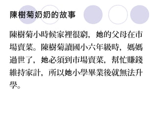 陳樹菊奶奶的故事講述了她在貧窮中長大,為了家庭早早進入市場工作。四十多年來,她熱心於幫助他人,捐款成立圖書館,並希望未來能蓋醫院改善窮人的醫療條件。她每天辛苦賣菜,卻總能將小錢省下來回饋社會,展現了不平凡的愛心與奉獻精神。