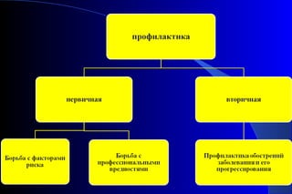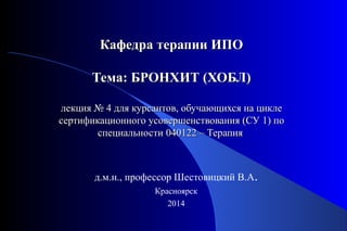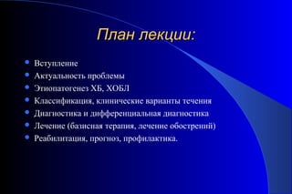 Документ представляет собой лекцию по хронической обструктивной болезни легких (ХОБЛ), включающую определения, этиопатогенез, диагностику и лечение. Он освещает современные подходы к пониманию ХОБЛ как прогрессирующего заболевания, а также факторы риска и методы профилактики. Основное внимание уделяется клиническим проявлениям, обострениям и программе реабилитации пациентов.