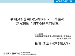 4年間で卒業できるか否かが、何によって決定されるのかを探った。具体的には、特定の大学の卒業生のデータを一部抽出し、4年間でストレート卒業した学生と、4年間でストレート卒業しなかった学生の2群に対する判別分析を行い、両群の差が何に起因するのかを推測した。