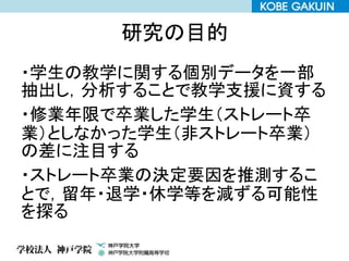 結果として、全学ベースではなく学部学科ベースでの議論が適切であることや、入試種別が一部の学部学科を除いてストレート卒業の可否にあまり関係していないこと等がわかった。