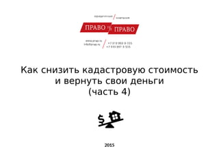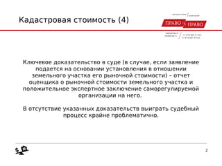 Документ описывает процесс снижения кадастровой стоимости земли через судебные разбирательства, акцентируя внимание на важности наличия отчета оценщика и экспертного заключения. Он подчеркивает, что отсутствие этих документов может затруднить выигрыш дела из-за возможных оспариваний со стороны оппонентов. Также обсуждаются ключевые моменты, на которые стоит обратить внимание, чтобы повысить шансы на успех в судебном процессе.