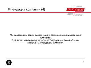 Документ описывает процесс завершения ликвидации компании, включая важные этапы, такие как проведение инвентаризации, составление ликвидационного баланса и подача документов в налоговый орган. Основное внимание уделяется соблюдению законодательства РФ и порядку распределения имущества между учредителями. Заключительный шаг включает в себя регистрацию ликвидации в ЕГРЮЛ и получение подтверждения о ликвидации.
