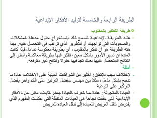 تناقش الوثيقة طرق التفكير الإبداعي وكيفية توليد الأفكار الجديدة من خلال تقنيات مثل التفكير بالمقلوب وطريقة الإضافة. تقدم أمثلة توضح كيفية استخدام هذه الطرق في الحياة الشخصية والمهنية، مثل العيادات المتنقلة وإنتاج الشاي المثلج. كما تتضمن القوانين العشرة لإدارة العقلية الإبداعية التي تعزز من القدرة على الابتكار.