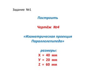 Документ содержит инструкции по построению изометрических проекций параллелепипедов трех различных размеров. Указаны подробные шаги, включая нанесение отрезков по осям и соединение вертикальных лучей. Чертежи обозначены как no4, no5 и no6 с соответствующими размерами.