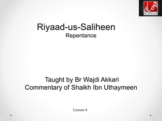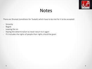 The document summarizes several hadith regarding repentance. It outlines the conditions for repentance to be accepted as sincerity, regret, giving up the sin, and resolving not to return to it. It then provides 3 hadith describing how the Prophet sought forgiveness 70 times or more daily and encouraged others to repent, showing how important repentance is. A final hadith notes Allah will accept repentance until death and has kept a doorway to repentance open since creation that will remain so until the Day of Judgment.
