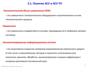 Документ представляет собой введение в автоматизированную информационную систему (АСУ) и автоматизированные системы управления технологическими процессами (АСУ ТП), объясняя их основные функции, структуру и принцип действия. Он также описывает уровень взаимодействия различных компонентов, включая программное и аппаратное обеспечение, и их роль в эффективном управлении производственными процессами. Основное внимание уделяется целями интеграции технологии в металлургии и других отраслях, улучшая управление и оптимизацию процессов.