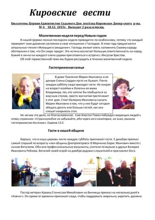 Бюллетень церкви адвентистов седьмого дня посёлка Кировское описывает мероприятия, связанные с молитвенной неделей и предстоящими рождественскими праздниками, акцентируя внимание на духовной подготовке и личной ответственности членов церкви. В документе также говорится о гостеприимстве в общине, помощи заключённым и программе общения с инвалидами, а также о духовном развитии через проповеди. Кроме того, предлагаются мероприятия на ближайшие дни, включая новогодние и рождественские праздники.
