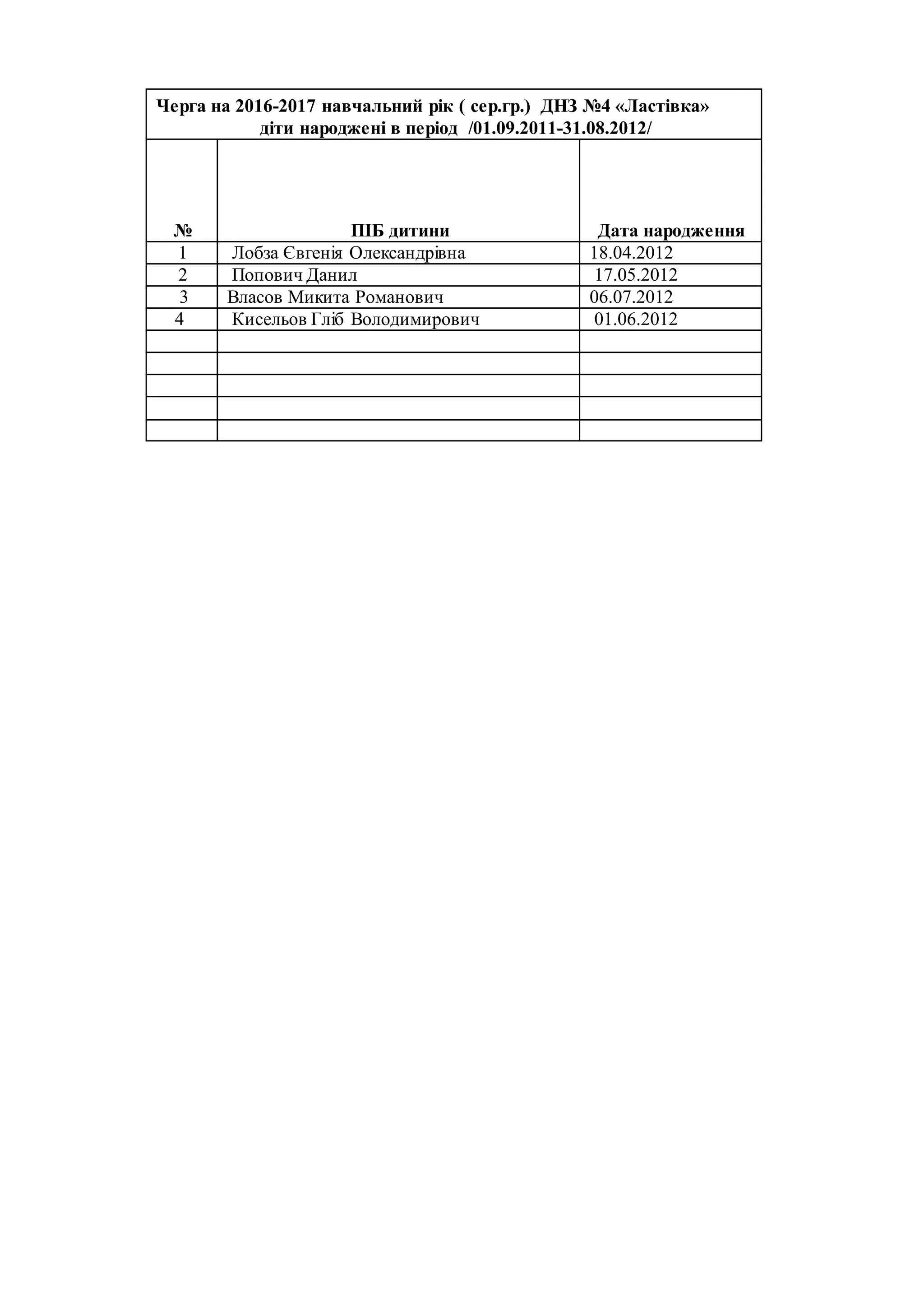 Черга на 2016-2017навчальний рік ( сер.гр.) ДНЗ №4 «Ластівка»