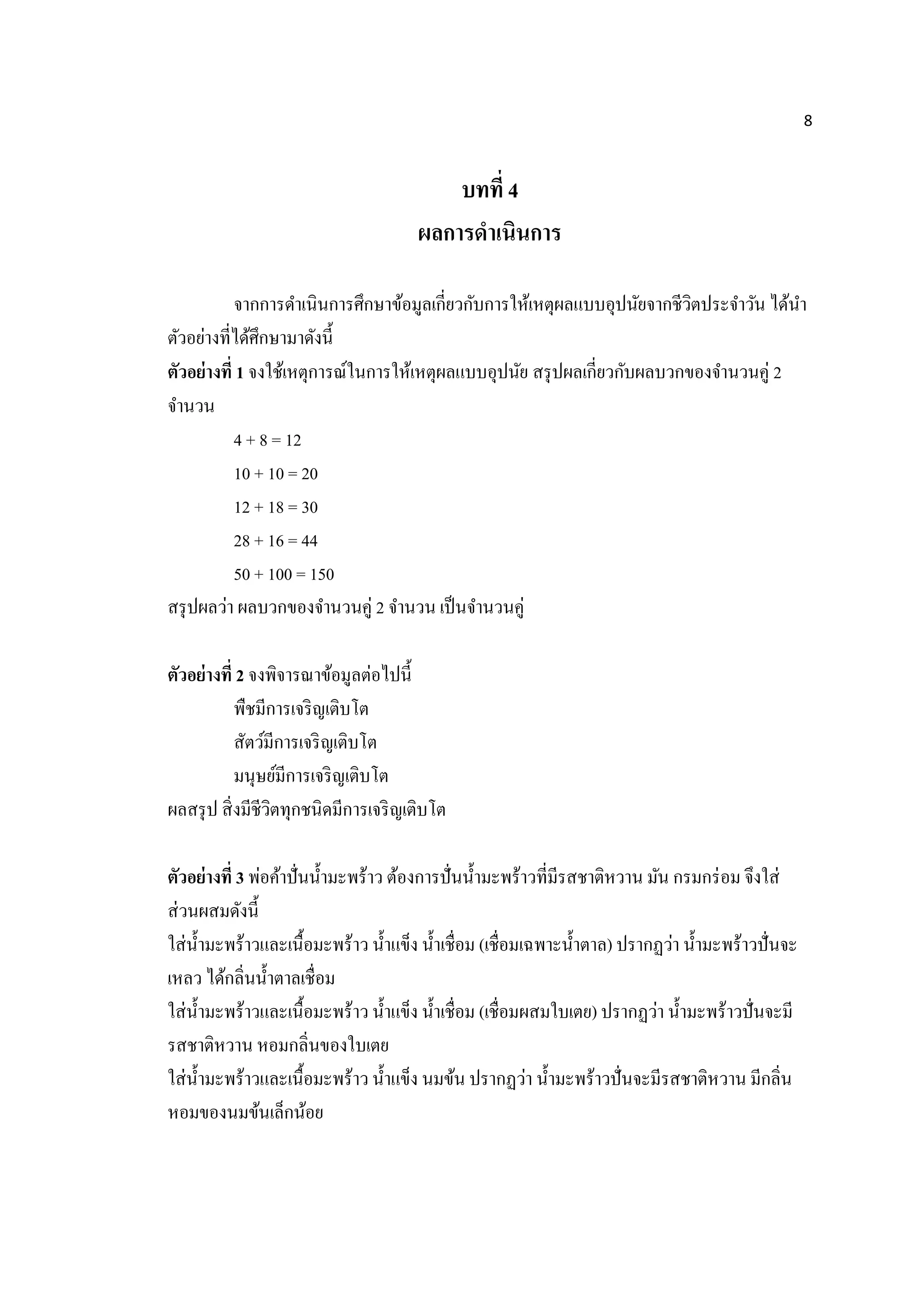 1 จงใช้เหตุการณ์ในการให้เหตุผลแบบอุปนัย สรุปผลเกี่ยวกับผลบวกของจานวนคู่ 2 จานวน 4 + 8 = 12 10 + 10 = 20 12 + 18 = 30 28 + 16 = 44 50 + 100 = 150 สรุปผลว่า ผลบวกของจานวนคู่ 2 จานวน เป็นจานวนคู่ ตัวอย่างที่ 2 จงพิจารณาข้อมูลต่อไปนี้ พืชมีการเจริญเติบโต สัตว์มีการเจริญเติบโต มนุษย์มีการเจริญเติบโต ผลสรุป สิ่งมีชีวิตทุกชนิดมีการเจริญเติบโต ตัวอย่างที่ 3 พ่อค้าปั่นน้ามะพร้าว ต้องการปั่นน้ามะพร้าวที่มีรสชาติหวาน มัน กรมกร่อม จึงใส่ ส่วนผสมดังนี้ ใส่น้ามะพร้าวและเนื้อมะพร้าว น้าแข็ง น้าเชื่อม (เชื่อมเฉพาะน้าตาล) ปรากฏว่า น้ามะพร้าวปั่นจะ เหลว ได้กลิ่นน้าตาลเชื่อม ใส่น้ามะพร้าวและเนื้อมะพร้าว น้าแข็ง น้าเชื่อม (เชื่อมผสมใบเตย) ปรากฏว่า น้ามะพร้าวปั่นจะมี รสชาติหวาน หอมกลิ่นของใบเตย ใส่น้ามะพร้าวและเนื้อมะพร้าว น้าแข็ง นมข้น ปรากฏว่า น้ามะพร้าวปั่นจะมีรสชาติหวาน มีกลิ่น หอมของนมข้นเล็กน้อย