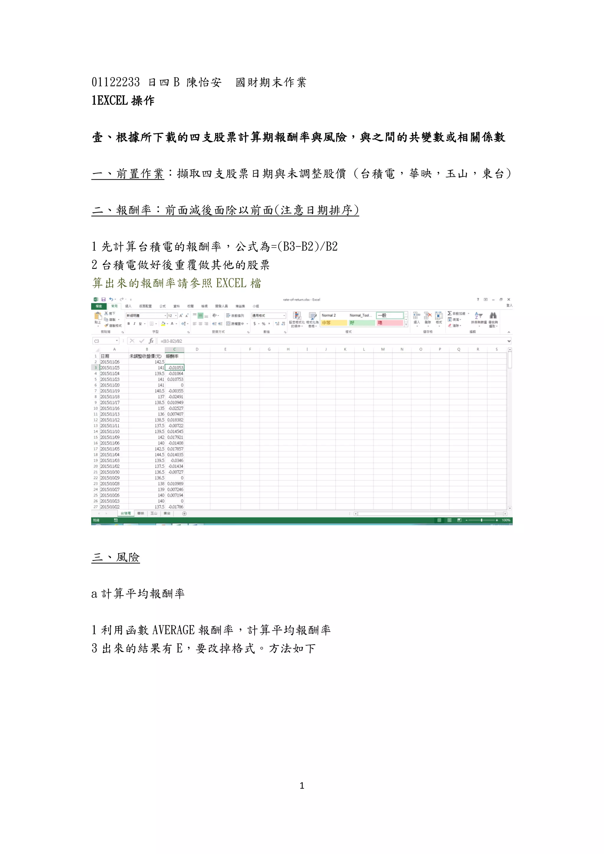 本文件涉及对四支股票(台积电、华映、玉山、东台)的期报酬率和风险分析,包括计算报酬率、风险、协方差矩阵及投资组合标准差。最终结论指出,四支股票的风险普遍高于报酬率,尤其华映的表现突出,且市场风险分析显示四支股票的回归系数均小于1,表明市场风险较低。最后,文件还探讨了与汇率及利率相关的经济模型(PPP和IRP)分析,结果显示这些模型未能成立。