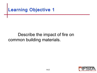 This document discusses the impact of fire on building construction. It covers various building materials like wood, masonry, metal, concrete, gypsum and others, and how each is affected by heat. It also addresses construction classifications, occupancy types, and basic components of buildings like foundations, floors, walls, roofs, doors, windows and more. The goal is to educate firefighters on understanding building construction in order to safely and effectively fight fires.