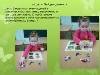 Документ представляет собой презентацию о применении развивающих игр для речевого развития детей младшего возраста. Игра 'найдем домик' направлена на закрепление знаний о животных и их среде обитания, а также на развитие пространственных понятий. Основные задачи игры включают обогащение представлений детей о диких животных и развитие их мышления, памяти и внимания.