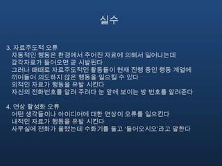 실수3. 자료주도적 오류자동적인행동은 환경에서 주어진 자료에 의해서 일어나는데 감각자료가 들어오면 곧 시발된다그러나 때때로 자료주도적인 활동들이 현재 진행 중인 행동 계열에 끼어들어 의도하지 않은 행동을 일으킬 수 있다외적인 자료가 행동을 유발 시킨다자신의 전화번호를 알려 주려다 눈 앞에 보이는 방 번호를 알려준다4. 연상 활성화 오류 어떤 생각들이나 아이디어에 대한 연상이 오류를 일으킨다내적인 자료가 행동을 유발 시킨다사무실에 전화가 울렸는데 수화기를 들고 ‘들어오시오’라고 말한다