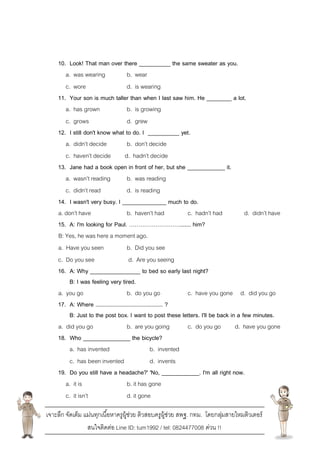 The document contains 30 multiple choice questions testing English grammar knowledge related to verb tenses and structures. The questions cover a range of topics including present simple, present continuous, past simple, future forms, modals and more. For each question, the correct answer is provided.