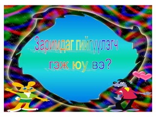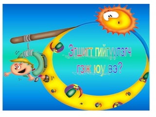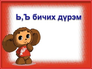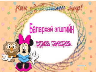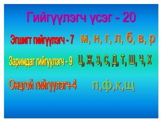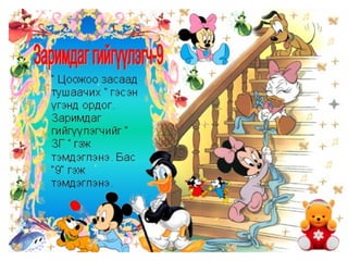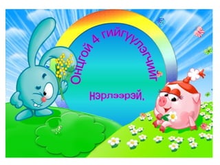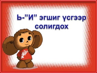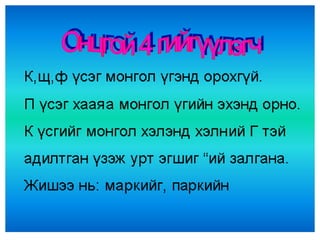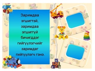 4а эцэг эх 1. 2. 3. 4. 5. 6. 7. 8. 9. 10. 11. 12. 13. Балархай эгшгийн үүрэг Slide 18 Балархай эгшиг 7 7 , 9 9 , 9 7 На,нэ,но,нө Га,го Тодотгон холбох “ Х ” Оноосон нэр Дан - охин Давхар- ангир эгшигжүүлэх ялгах Зөөлнийг тэмдэглэх 14. 15. 9+9=+Э Нөхцөл, нухаш,хувцас,ордог, Үзсэн,навчис,хуудас, боддог, Нөхц ө лийн, нухшаар,хувцсыг, бодд о гоор,ордгоор, Үзс э нийг,навчсаар,хуудсыг 16. 7+7=+Э Бамбар ,газар,ашиг,тоолол,алдар, тэмдэг,ажилсаг,баялаг, өгүүлбэр Бамбарын, газраас,ашгаар, тооллын,алдрыг, тэмдгийг, ажилсгийг, баялгийг, өгүүлбэрээс 17. 9+9=-Э Зөрчил- С Х+ТЧ= -Э Түүхт,усч,төрөлхтний, эрхтний , уст, цомхтгол,эмхтгэл, тусч-тусаж 18. сан а л, арг а л,үн э н,эмн э г,туг а л,он о л,сон о р,хорг о л,өн ө р Сан а лаар, арг а лын,үн э нээр, эмн э гийг,туг а лаас он о лоор,сон о рыг, хорг о лыг Хавх- хавах Савх- савах Чанх- чанах Нялх- нялах Шарх- шарах Сүхбаатар, Завхан,Төмөр,Идэр,Хайрхан, Идэр, Хойлог Сүхбаат а рын, Завх а наас,Төм ө рийн,Ид э рээс,Хайрх а ныг, Хойл о гоор 19. Охин, танил, анир, тамир, зориг, холих, солир,ангир,янгир, ховил Охиныг, танилаар, тамирыг, анираас, , зоригоор, холихыг, солирыг,ангирын, янгирыг, ховилоор 20. 21. Барив,барьцгаа,барьж, захижээ,захицгаа,захилаа, хорив,хорьж,Морьтон,морьгүй, буурьтай,арьс,хуульч,хувьтай 22. 23. Эм үг+е=ье Эр үг+я,ё=ъя,ъё шууд Гийгүүлэгчээр төгссөн Эгшиг-Хос, богино,урт Ь 24. Бодъё,давтъя,үзье,олгоё, хатаая, уяя,давхия,оёё,ургуулъя, хөгжүүлье, чармайя, очъё, барья, тарья, цоройё 25. 26. 27. эгшиг+ Л = шууд Туул, тоол, харайл, ботгол, таргал, үнэл, дө рөөл, дөнгөл, даргал, ар гал, тариал 7+ Л = Л Э Тагла, хэрэглэ, ашигла,сумла, нэрлэ, малла, ажилла, 9+ Л = Э Л Бутал, борцол,тусал, давсал,тасал нясал, Ь+ Л = И Л ханил, барил,сорил, 28. уушги, байцай, хуйцай, шанцай,эрвээхий, дэгдээхий, шавж,нэлээд, хэчнээн, бөлцийх,төвшин, байгал нуур, байгаль дэлхий, бүтээгдэхүүн,идэвх, Сумьяа, гавьяа 29. Хатуужлын тангараг Хүн хатуужъя гэвэл: Õүйтэнд хөрье Õалуунд халъя Õөдөө хөхөрье Ãадаа гандъя Õар ажилд нухалагдъя Õатуу шаардлаганд эдлэгдье Õарз усанд биеэ булхъя Õяруу цасанд хөл нүцгэн явъя Íойргүй хоноё Õоолгүй өнжье гэх мэт тангарагтай ажиллана. Ингэж ажиллая уу? Байя уу? 30. Цээжээр дүрмээ санацгаая Дэвтэрлэ Боловсролоо ахиулъя Даалгавраа Нэрлэсэн яндангийн Хоногоор Сургуулийн Сурагчийн Аймгийн Олдсоноо Сурагчдадаа охины Уншдагийг Зурдгийг Үзье Уншъя Саная Оёё уяя Хүсье Ажиллалаа Хүргэе Усалъя Хоньгүй Захина 31.