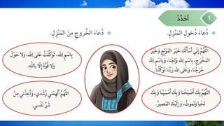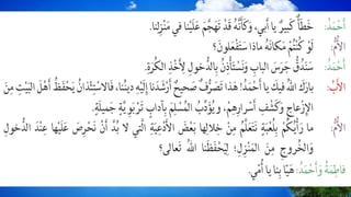يتناول الكتاب آداب الاستئذان والاستماع، موضحًا كيفية الحفاظ على الهدوء والاحترام أثناء دخول المنزل. يتضمن دعاء الدخول والسلام على الأهل ومراعاة النظام والآداب الإسلامية. يشدد على أهمية حسن الخلق والطاعة في التعامل مع الآخرين.