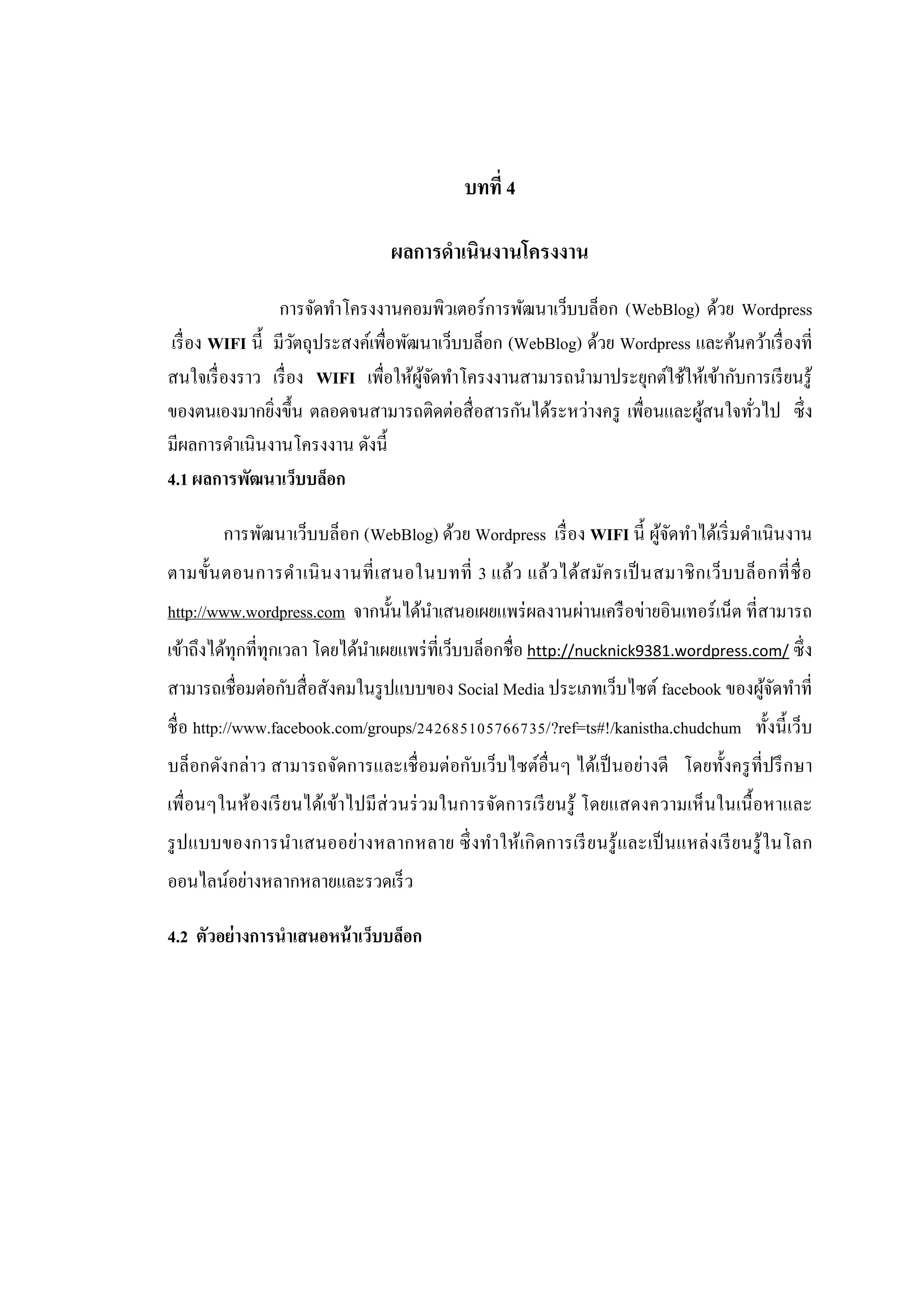 ผลการดาเนินงานโครงงาน การจัดทาโครงงานคอมพิวเตอร์การพัฒนาเว็บบล็อก (WebBlog) ด้วย Wordpress เรื่ อง WIFI นี้ มีวตถุประสงค์เพื่อพัฒนาเว็บบล็อก (WebBlog) ด้วย Wordpress และค้นคว้าเรื่ องที่ ั สนใจเรื่ องราว เรื่ อง WIFI เพื่อให้ผจดทาโครงงานสามารถนามาประยุกต์ใช้ให้เข้ากับการเรี ยนรู ้ ู้ ั ของตนเองมากยิงขึ้น ตลอดจนสามารถติดต่อสื่ อสารกันได้ระหว่างครู เพื่อนและผูสนใจทัวไป ซึ่ง ่ ้ ่ มีผลการดาเนินงานโครงงาน ดังนี้ 4.1 ผลการพัฒนาเว็บบล็อก การพัฒนาเว็บบล็อก (WebBlog) ด้วย Wordpress เรื่ อง WIFI นี้ ผูจดทาได้เริ่ มดาเนินงาน ้ั ตามขั้น ตอนการด าเนิ น งานที่ เ สนอในบทที่ 3 แล้ว แล้ว ได้ส มัค รเป็ นสมาชิ ก เว็บ บล็ อ กที่ ชื่ อ http://www.wordpress.com จากนั้นได้นาเสนอเผยแพร่ ผลงานผ่านเครื อข่ายอินเทอร์ เน็ต ที่สามารถ เข้าถึงได้ทุกที่ทุกเวลา โดยได้นาเผยแพร่ ที่เว็บบล็อกชื่อ http://nucknick9381.wordpress.com/ ซึ่ ง สามารถเชื่อมต่อกับสื่ อสังคมในรู ปแบบของ Social Media ประเภทเว็บไซต์ facebook ของผูจดทาที่ ้ั ชื่ อ http://www.facebook.com/groups/242685105766735/?ref=ts#!/kanistha.chudchum ทั้งนี้ เว็บ บล็อกดังกล่าว สามารถจัดการและเชื่ อมต่อกับเว็บไซต์อื่นๆ ได้เป็ นอย่างดี โดยทั้งครู ที่ปรึ กษา เพื่อนๆในห้องเรี ยนได้เข้าไปมี ส่วนร่ วมในการจัดการเรี ยนรู ้ โดยแสดงความเห็ นในเนื้ อหาและ รู ป แบบของการนาเสนออย่างหลากหลาย ซึ่ งท าให้เกิ ดการเรี ย นรู ้ และเป็ นแหล่ ง เรี ย นรู ้ ในโลก ออนไลน์อย่างหลากหลายและรวดเร็ ว 4.2 ตัวอย่างการนาเสนอหน้ าเว็บบล็อก