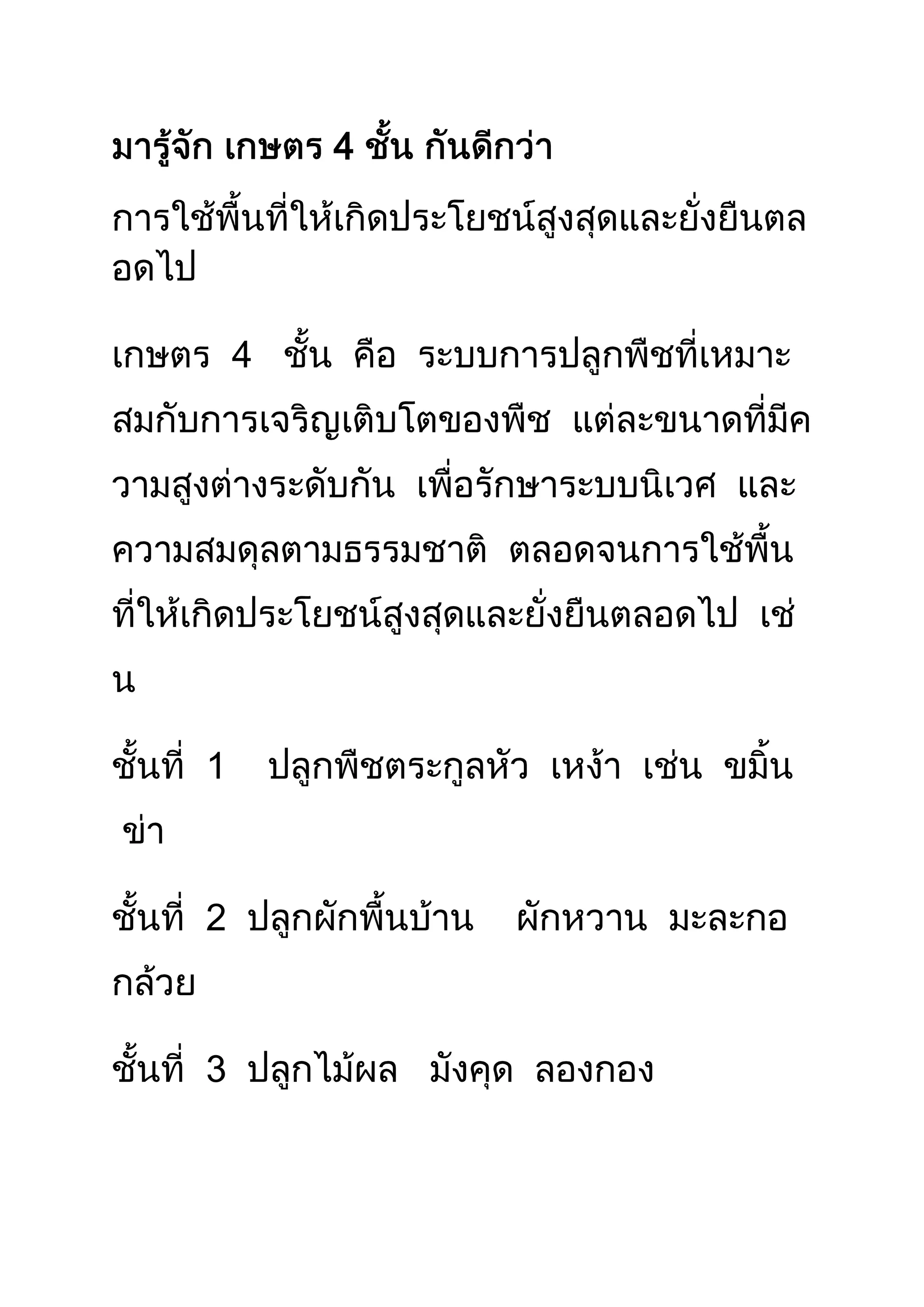 มารู้จัก เกษตร 4ชั้น กันดีกว่า <br />การใช้พื้นที่ให้เกิดประโยชน์สูงสุดและยั่งยืนตลอดไป <br />เกษตร 4 ชั้น คือ ระบบการปลูกพืชที่เหมาะสมกับการเจริญเติบโตของพืช แต่ละขนาดที่มีความสูงต่างระดับกัน เพื่อรักษาระบบนิเวศ และความสมดุลตามธรรมชาติ ตลอดจนการใช้พื้นที่ให้เกิดประโยชน์สูงสุดและยั่งยืนตลอดไป เช่น <br />ชั้นที่ 1 ปลูกพืชตระกูลหัว เหง้า เช่น ขมิ้น ข่า <br />ชั้นที่ 2 ปลูกผักพื้นบ้าน ผักหวาน มะละกอ กล้วย <br />ชั้นที่ 3 ปลูกไม้ผล มังคุด ลองกอง <br />ชั้นที่ 4 ปลูกไม้ผล ไม้ยืนต้น สะตอ มะพร้าว หมาก ทุเรียนพื้นบ้าน<br /> <br />