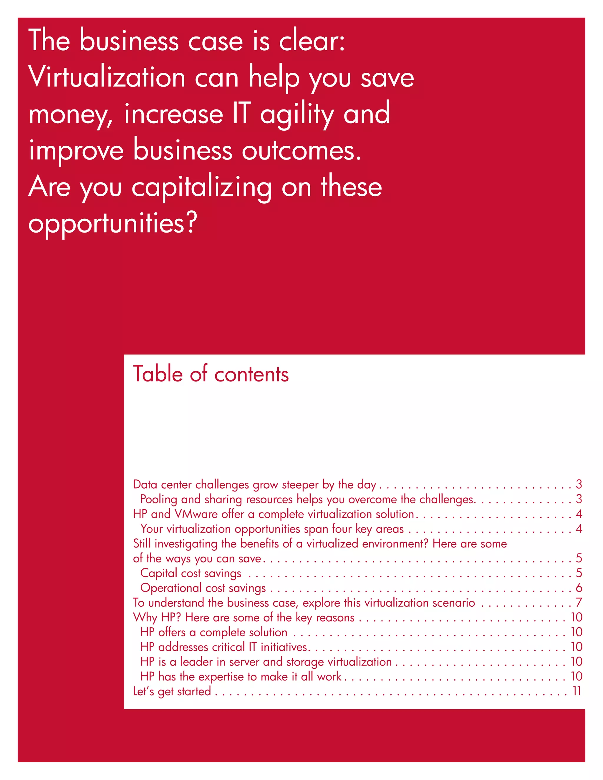 The document discusses the business case for virtualization using an HP and VMware solution. It outlines how virtualization can help reduce capital costs through server hardware consolidation and savings on storage, network hardware, and data center space. Virtualization also provides operational cost savings through reduced power and cooling costs, lower management costs from faster server provisioning, and reduced costs associated with disaster recovery and unplanned downtime. The document provides an example scenario showing how a company could realize over 60% savings over 3 years by consolidating 100 physical servers onto 13 physical servers using virtualization.