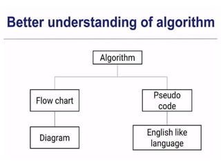 An algorithm is a precise set of unambiguous instructions that must be completed in a finite number of steps to solve a problem or reach a desired outcome. Key features of algorithms include being precise, unambiguous, terminating after a finite number of steps, avoiding infinite repetition of instructions, and obtaining the desired result upon termination. Examples provided calculate equality of two numbers, print the first 10 natural numbers, and find the sum of the first N natural numbers. Flow charts and pseudo code can be used to represent algorithms graphically or as informal high-level descriptions.