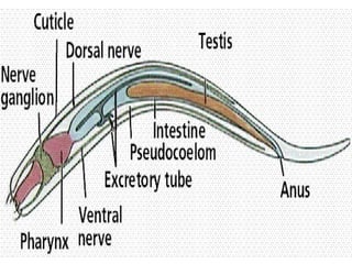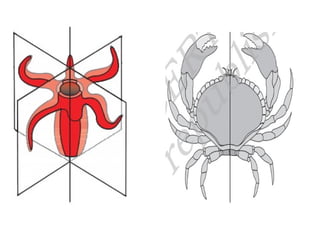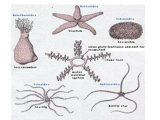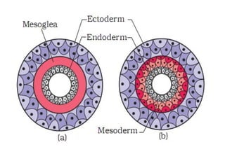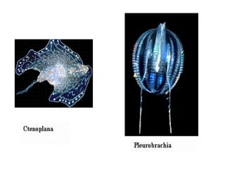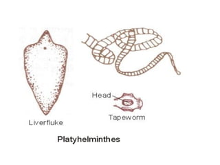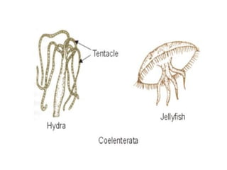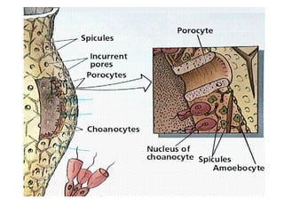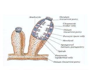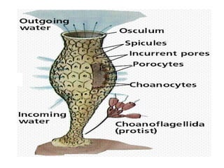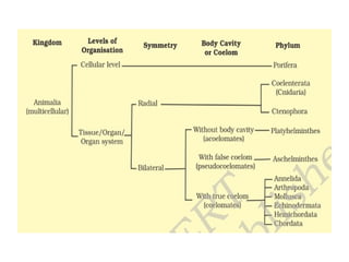 1. The document discusses the key characteristics of different animal phyla including Porifera, Coelenterata, Platyhelminthes, Nematoda, Annelida, Arthropoda, Mollusca, Echinodermata, Hemichordata, and Chordata.