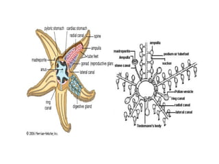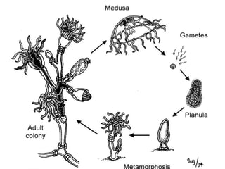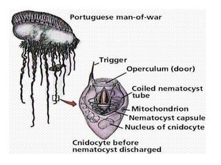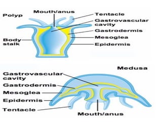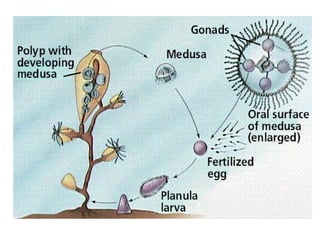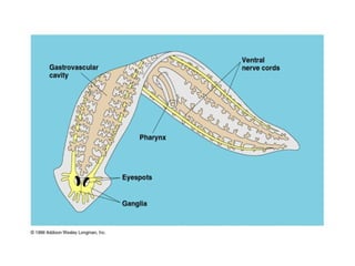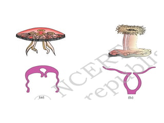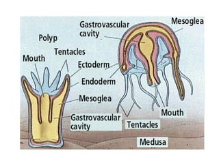 2. It describes their body structures, level of organization, symmetry, digestive and circulatory systems, reproduction, and examples of each phylum.